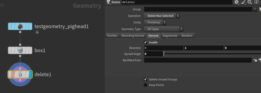 下の設定は「法線が (0, 1, 0) 方向を向いているプリミティブだけを残す」といった判定を行っているイメージです。
