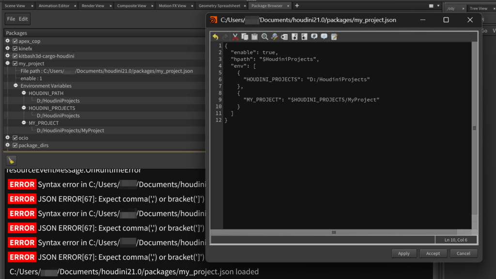 また定義した変数はパッケージのJSON内で使用できるので"HOUDINI_PROJECTS": "D:/HoudiniProjects"と定義したところに"MY_PROJECT": "$HOUDINI_PROJECTS/MyProject"と流用して使えます